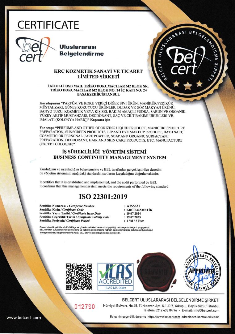 ISO 22301:2019 sertifikası, iş sürekliliği yönetimi konusunda uyguladığımız stratejilerin etkinliğini teyit eder. KRC Kozmetik, olası kesintilere karşı dayanıklılığımızı artırmak ve iş süreçlerimizin kesintisiz devamını sağlamak için bu standardı benimser.