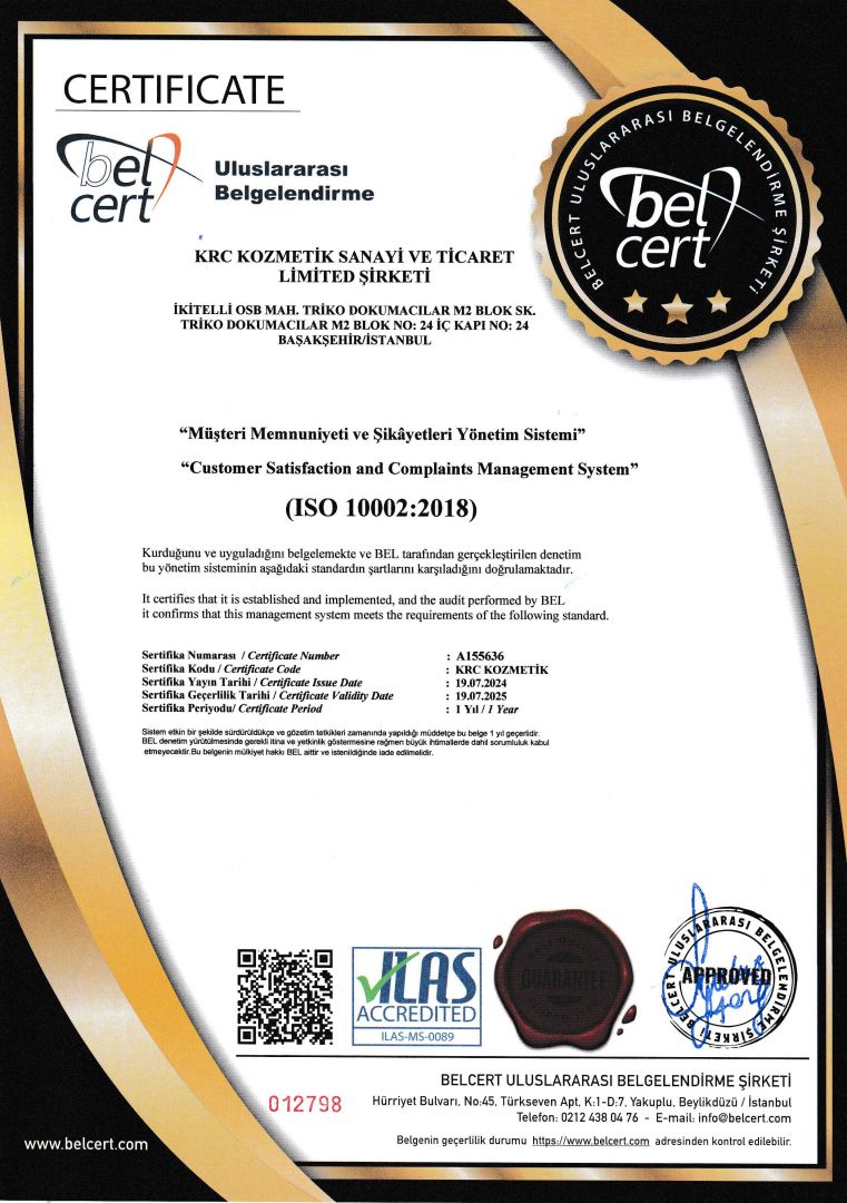 ISO 10002:2018, müşteri şikayetlerinin yönetimi konusunda şirketimizin yüksek standartlarda bir yaklaşım benimsediğini belgeleyen bir sertifikadır. KRC Kozmetik, müşterilerinin geri bildirimlerini etkin bir şekilde değerlendirme ve çözümleme konusundaki taahhüdünü bu standartla ortaya koyar.