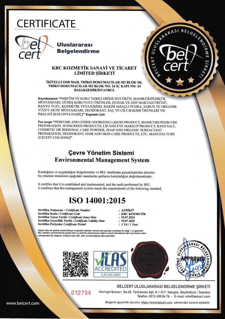 ISO 14001:2015 sertifikası, çevresel sorumluluklarımızı yerine getirdiğimizi ve çevre dostu uygulamaları benimsediğimizi gösterir. KRC Kozmetik, çevresel etkileri minimize etmek ve sürdürülebilirlik hedeflerine ulaşmak için kapsamlı bir çevre yönetim sistemi uygular.