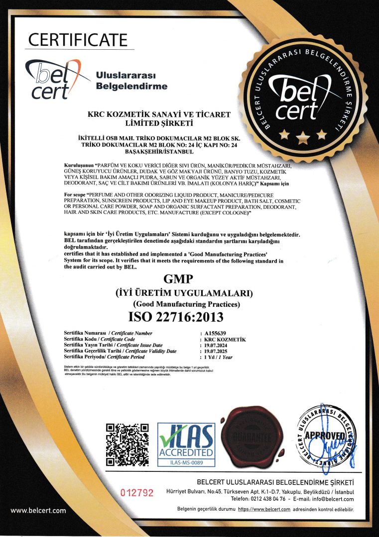 KRC Kozmetik, sektördeki en yüksek standartlara uyum sağlamak ve müşterilerine üstün hizmet sunmak amacıyla bir dizi uluslararası sertifikaya sahip olduğunu gururla duyurur. Bu sertifikalar, şirketimizin kalite, çevre, güvenlik ve sosyal sorumluluk alanlarındaki taahhütlerini ve mükemmeliyet hedeflerini yansıtmaktadır.