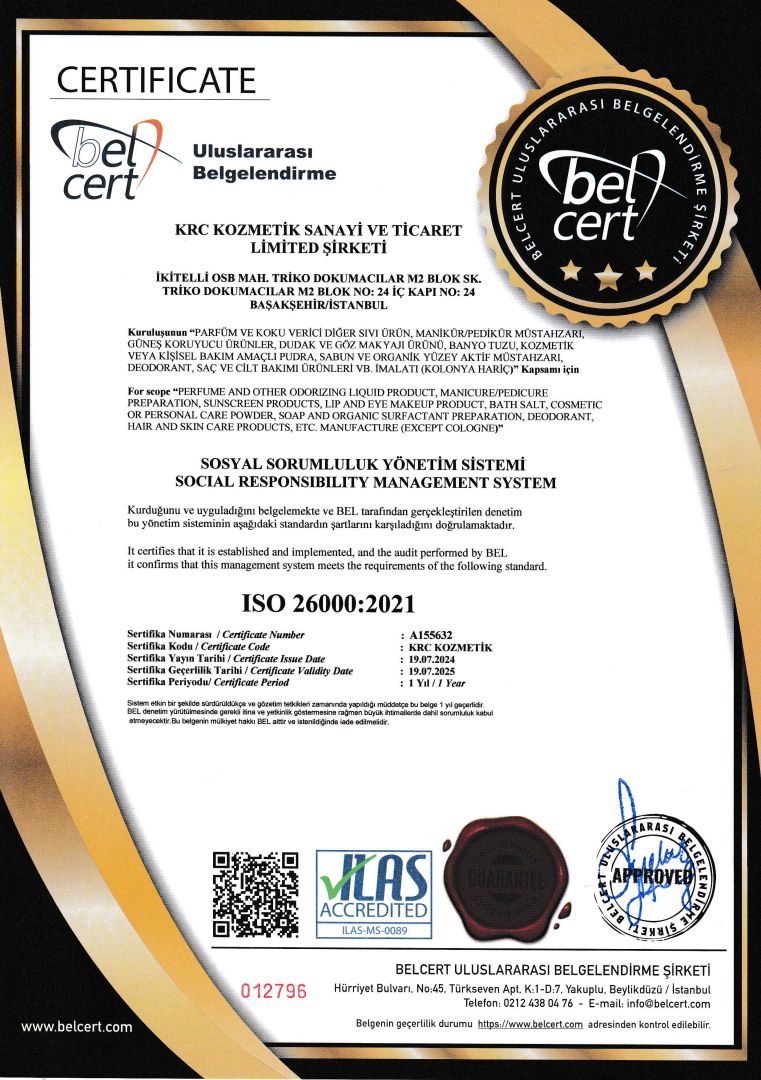 ISO 26000:2010, sosyal sorumluluk konusundaki taahhütlerimizi ve etik ilkelerimizi yansıtır. KRC Kozmetik, toplumsal sorumluluk projelerini destekler ve adil iş uygulamalarını teşvik eder, bu sertifika da bu yaklaşımımızı doğrular.