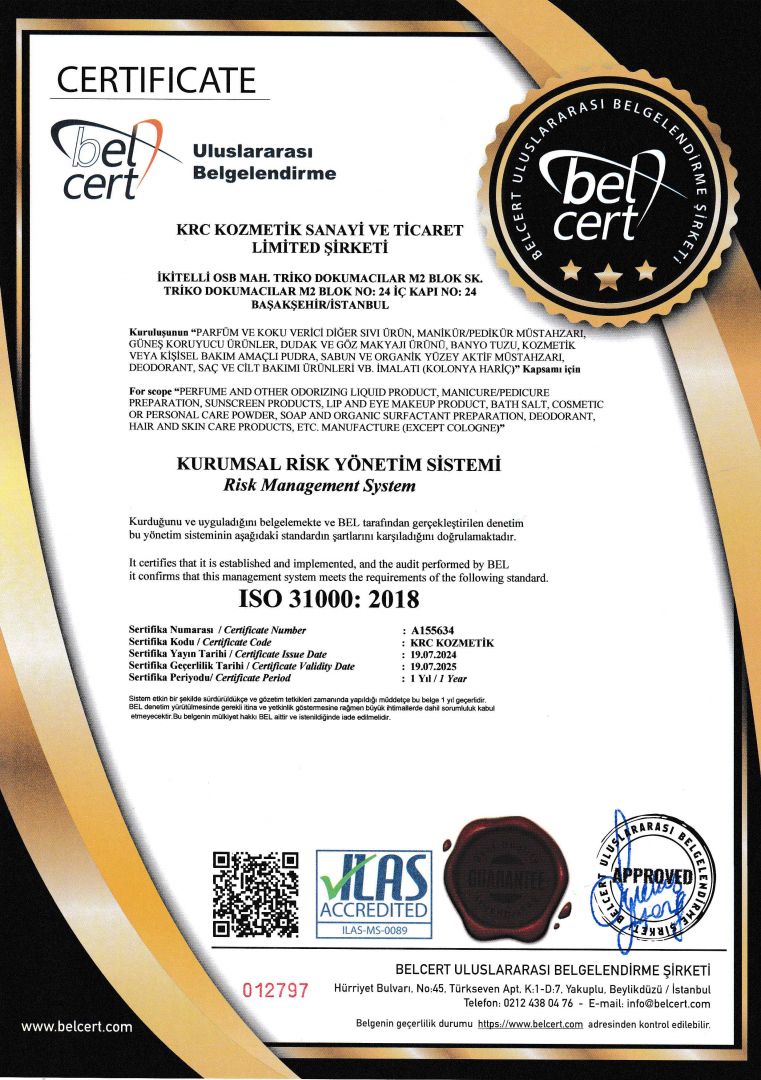 ISO 31000:2018 sertifikası, risklerin etkin bir şekilde yönetilmesini sağlayan sistemler kurduğumuzu ve riskleri önceden belirleyerek stratejik kararlar aldığımızı gösterir. KRC Kozmetik, iş süreçlerindeki belirsizlikleri azaltmak ve güvenli bir iş ortamı sağlamak için bu standardı uygular.
