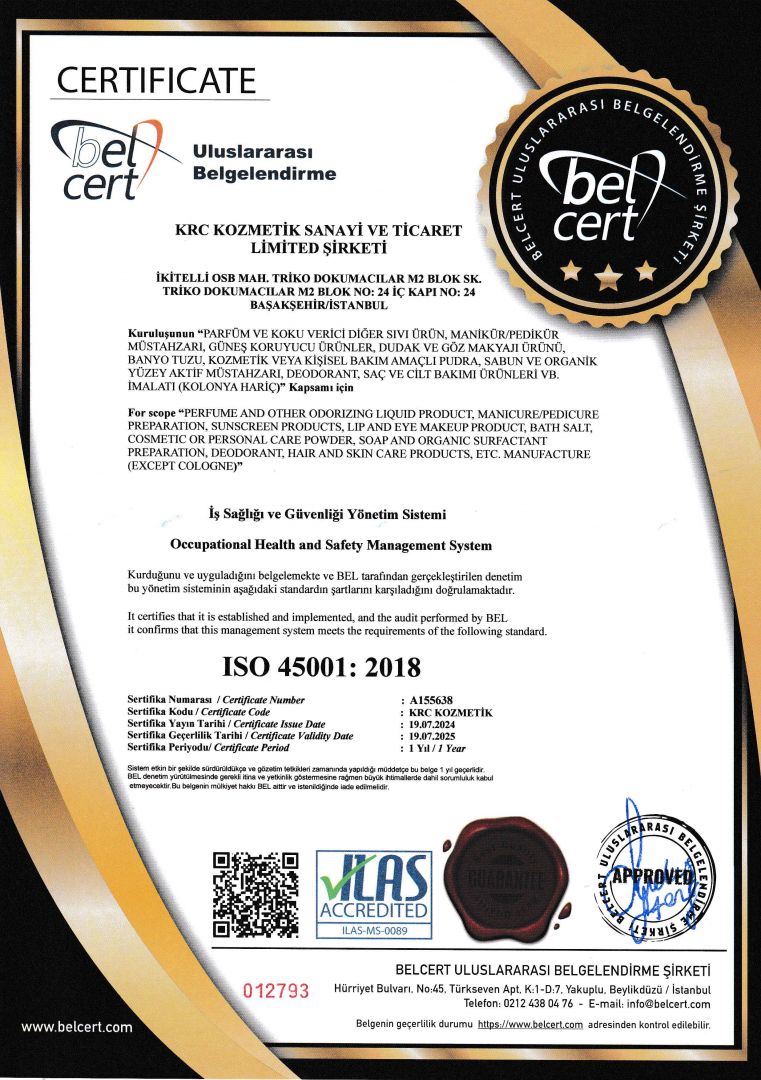 ISO 45001:2018 sertifikası, çalışanlarımızın sağlığını ve güvenliğini koruma konusunda yüksek standartlara sahip olduğumuzu gösterir. KRC Kozmetik, iş yerinde riskleri en aza indirgemek ve güvenli bir çalışma ortamı sunmak için kapsamlı bir iş sağlığı ve güvenliği yönetim sistemi uygular.