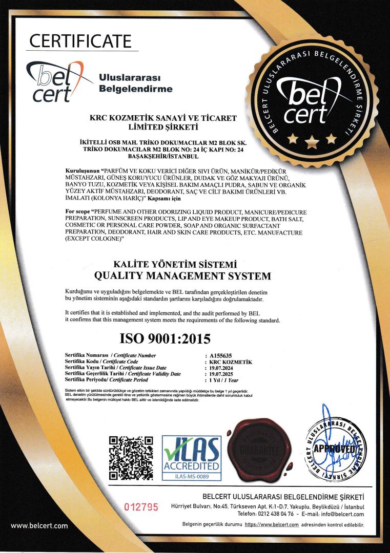 ISO 9001:2015, KRC Kozmetik'in kalite yönetim sisteminin uluslararası standartlara uygunluğunu teyit eder. Bu sertifika, müşteri memnuniyetini artırmak, süreçleri optimize etmek ve sürekli iyileştirme sağlamak için şirketimizde uygulanan yöntemlerin etkili ve güvenilir olduğunu gösterir.